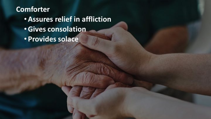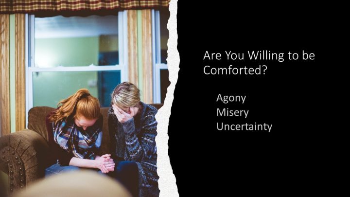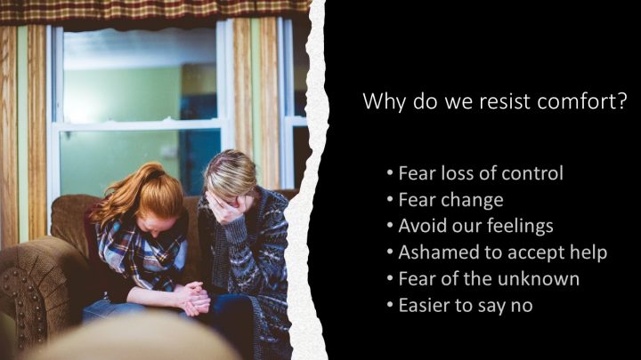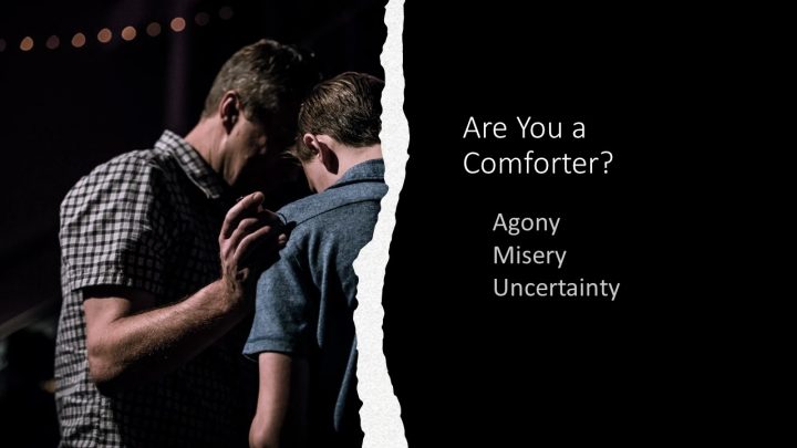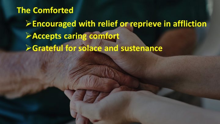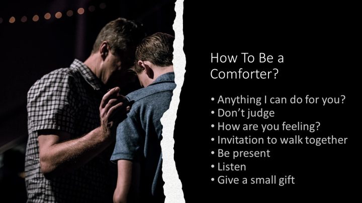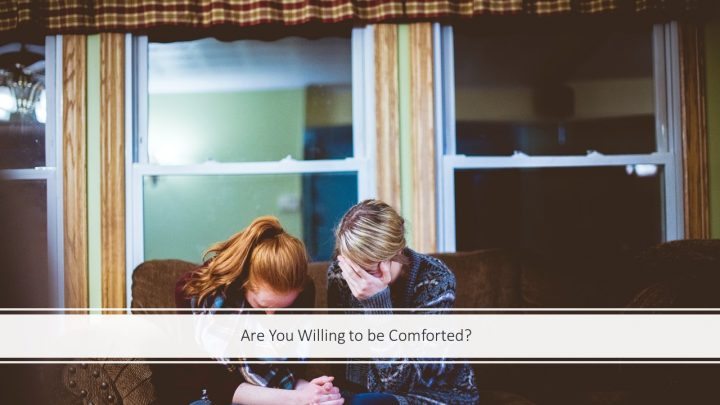 If so, are you also willing to be comforted? When you allow yourself to be comforted, you will become a more genuine, compassionate comforter. When we provide comfort, solace, encouragement, it is a little bit of salve for wounded hearts. You may not be part of a miracle that you can see, but that should not be your purpose. That is God’s job, not yours. You can help by being present, doing something together, a comforting word, a prayer, a gift. These things all help someone to heal in small ways, and small steps. It can lay a foundation for a hurting heart to allow God to enter in. We can all be comforters and the comforted.